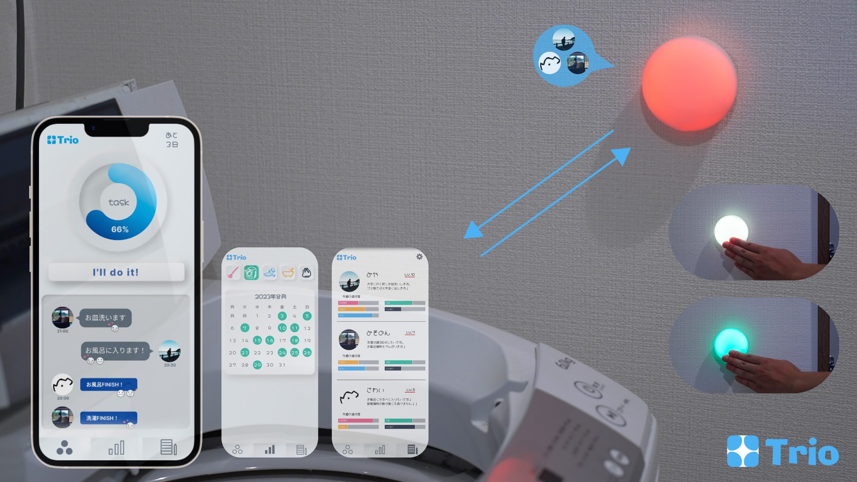 | 「Trio」は、1人暮らしの面倒くさがり屋な大学生や社会人向けのコミュニティ型タスク管理ツールです。アプリとスマートボタンを使用して、共通の目標を持つ3人の仲間で掃除の宣言やタスクの投稿をし合うことで、毎日の”洗う”をポジティブかつスムーズにこなせるようにサポートします。 |