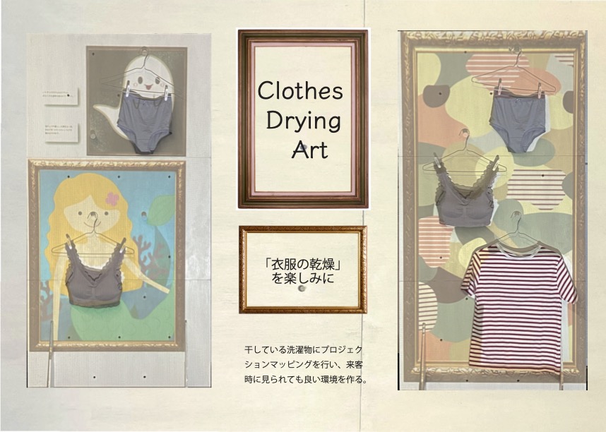 | プロジェクションマッピングを用いて、下着に動画像を投影することで部屋干しを作品に 変えるプロダクトである。 投影画像は何種類もあるため、 その日の気分に合わせたインテリ アに変えることが可能となる。 また、 付属の棒にはセンサが付けられており、 衣類の乾燥具 合がスマホアプリで分かるようになっている。 |