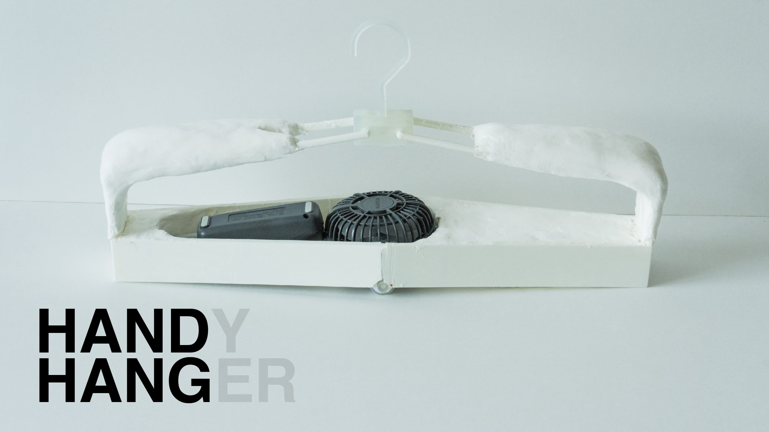 | 大切な服は大事に使ってあげたい。折りたたみハンガーHandHangがあれば、環境の整っていない場所でも手軽にお手入れが行えます。製品を取り出し、多くの人が持ち歩くハンディーファンをセット、室内にかけておくだけ。送風と形状により衣服の胴部分の膨らみができ、風通しの良い効率的な乾燥が見込めます。 |